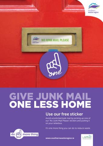 The Southern Region Waste Management Office and local authorities are issuing No Junk Mail Stickers free of charge to householders to reduce the amount of unsolicited mail delivered to households across the region. If you would prefer not to receive junk mail pick up one of these handy stickers from your local environment section and reduce the amount of junk mail you have to recycle. Thsi initiative is funded by the EPA through the Local Authority Prevention Network (LAPN)